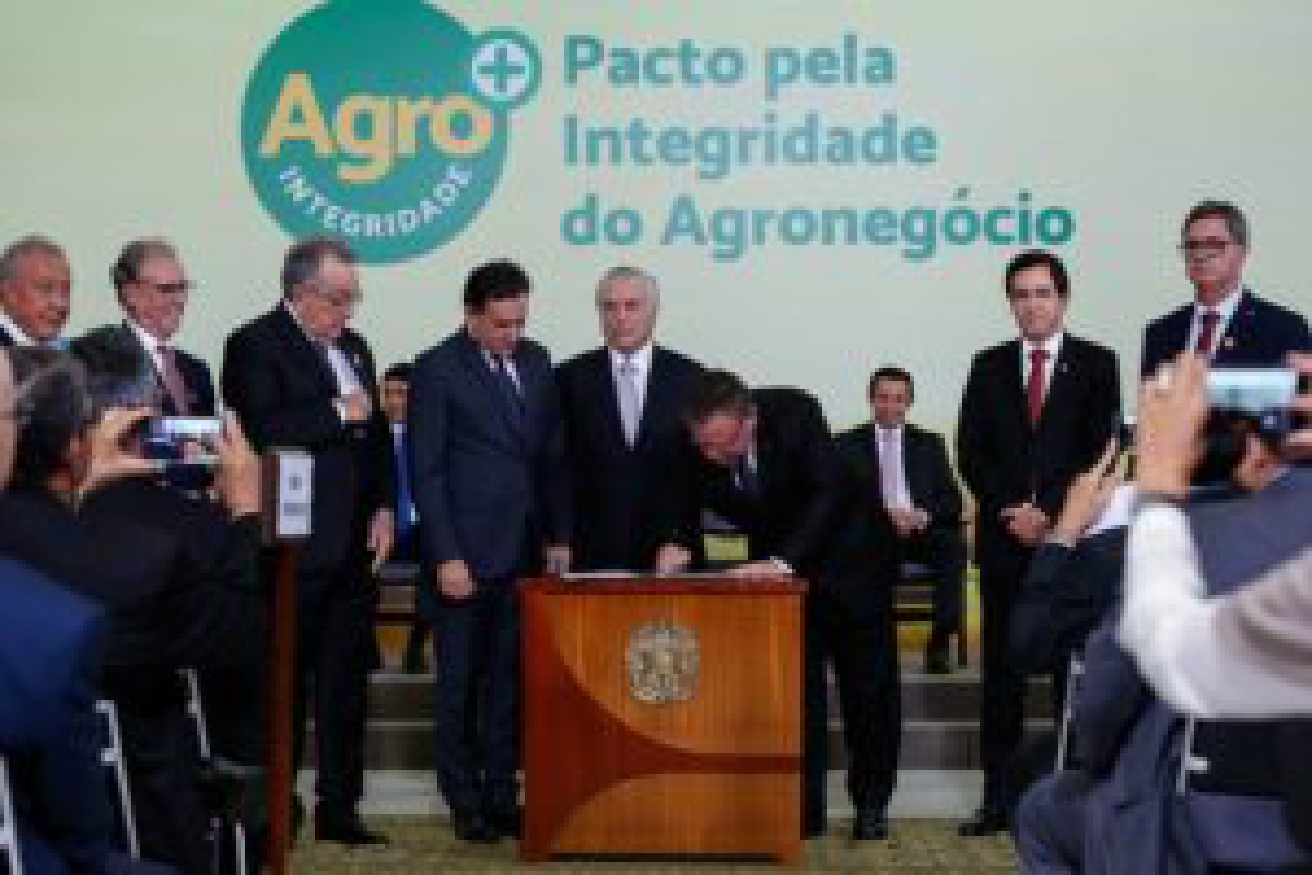 Em cerim?nia realizada no Pal?cio do Planalto, nesta ter?a-feira (12), o presidente Michel Temer e o ministro da Agricultura, Pecu?ria e Abastecimento (Mapa), Blairo Maggi, lan?aram o selo Agro Mais Integridade e firmaram o Pacto pela Integridade com empresas e entidades do agroneg?cio representadas pela Confedera??o da Agricultura e Pecu?ria do Brasil (CNA). ?Hoje, damos outro passo para aprimorar o ambiente institucional do agro e torn?-lo ainda mais eficiente?, disse o presidente em seu discurso.